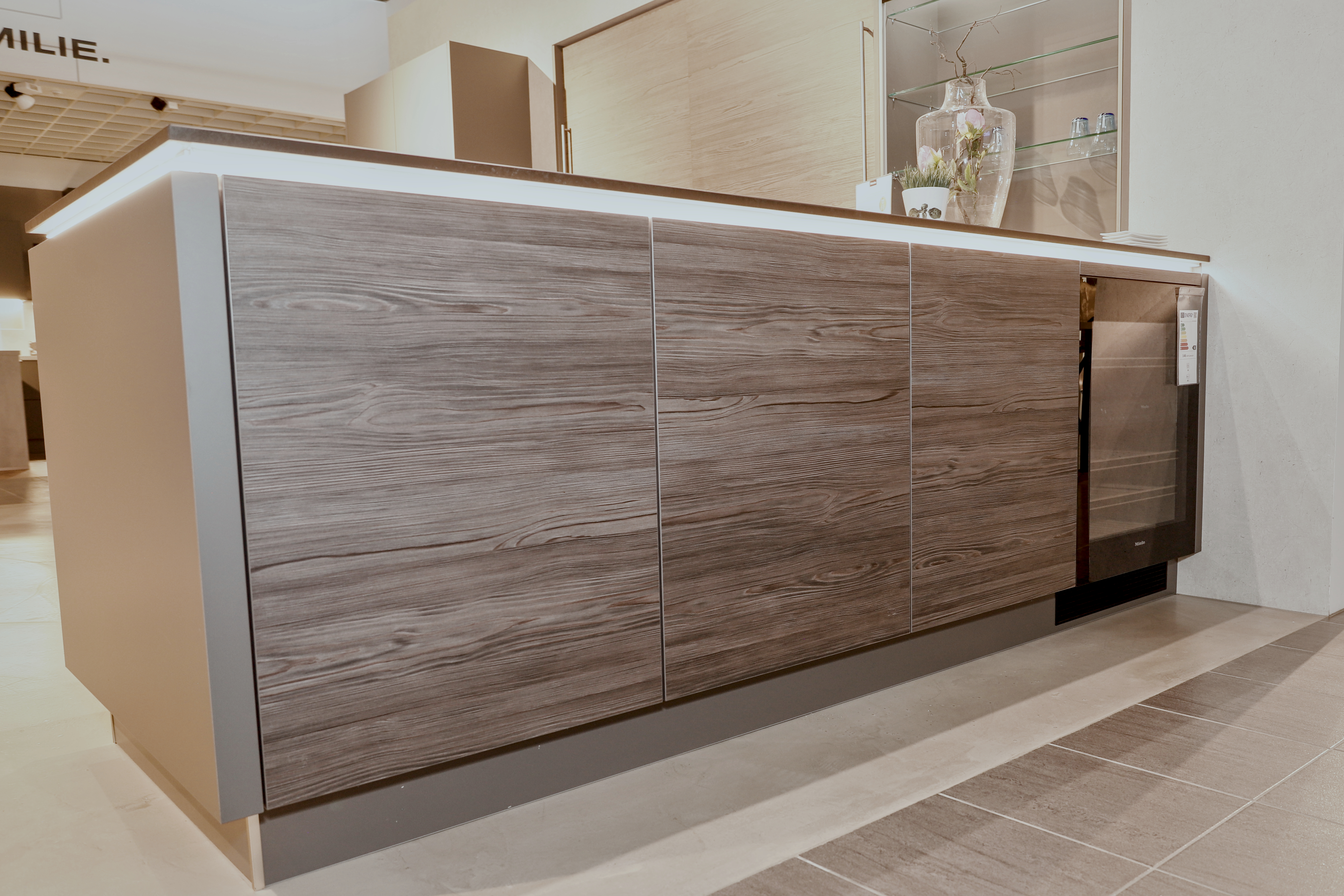 Das Inpura System AV 2035 ist eine hochwertige und moderne Inselküche mit Wohnschränken in lavagrau matt lackiert, kombiniert mit dem Holzdekor Pinie dunkel. Die umlaufenden LED-Griffleistenbeleuchtung verleiht der Küche ein stilvolles Ambiente. Hinter der Spüle befinden sich praktische Schiebetüren.