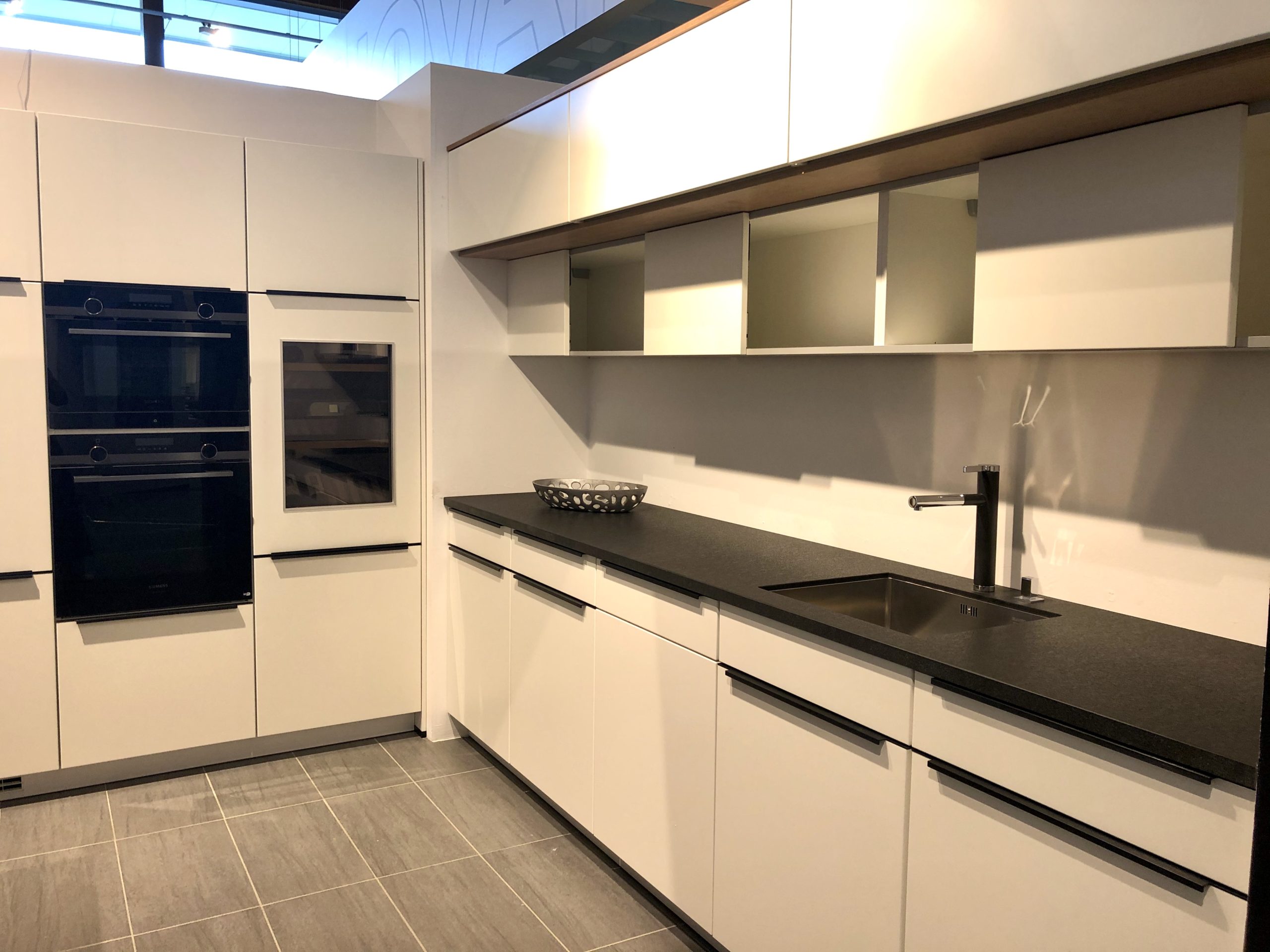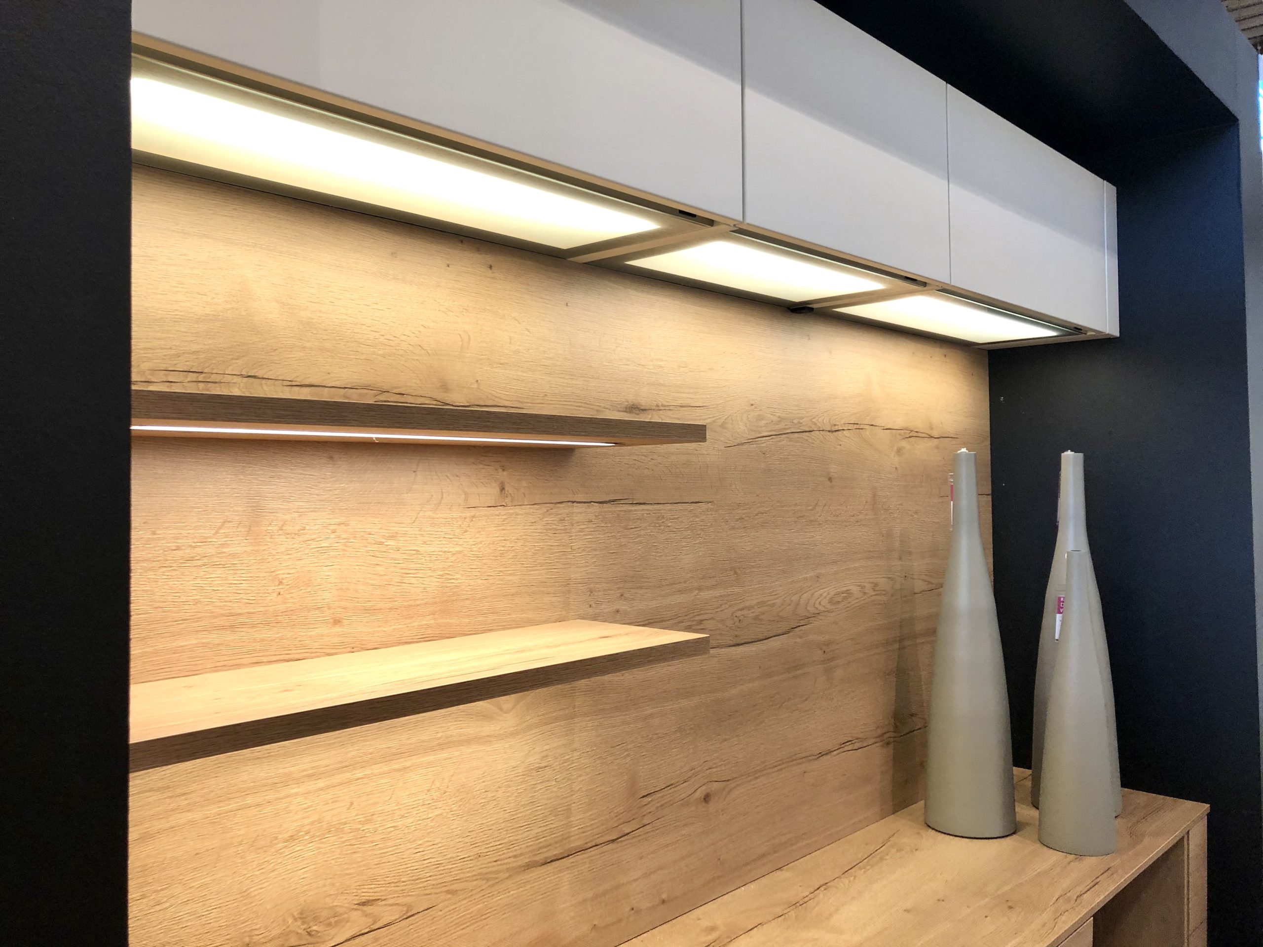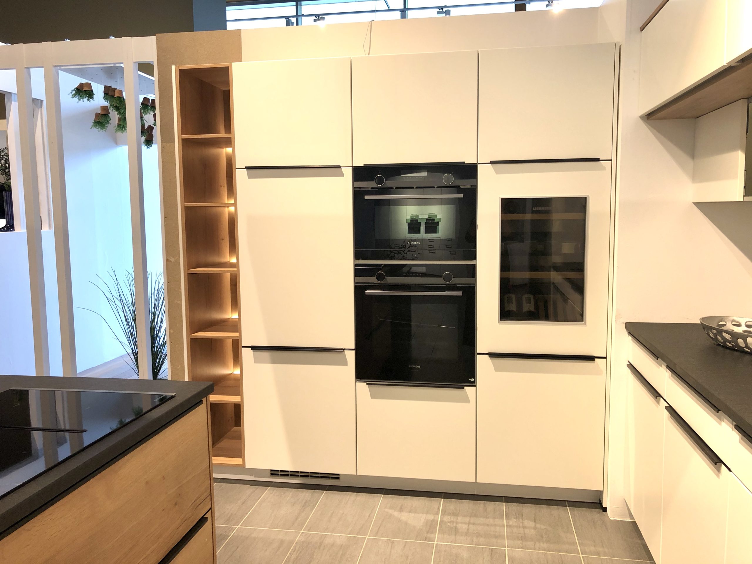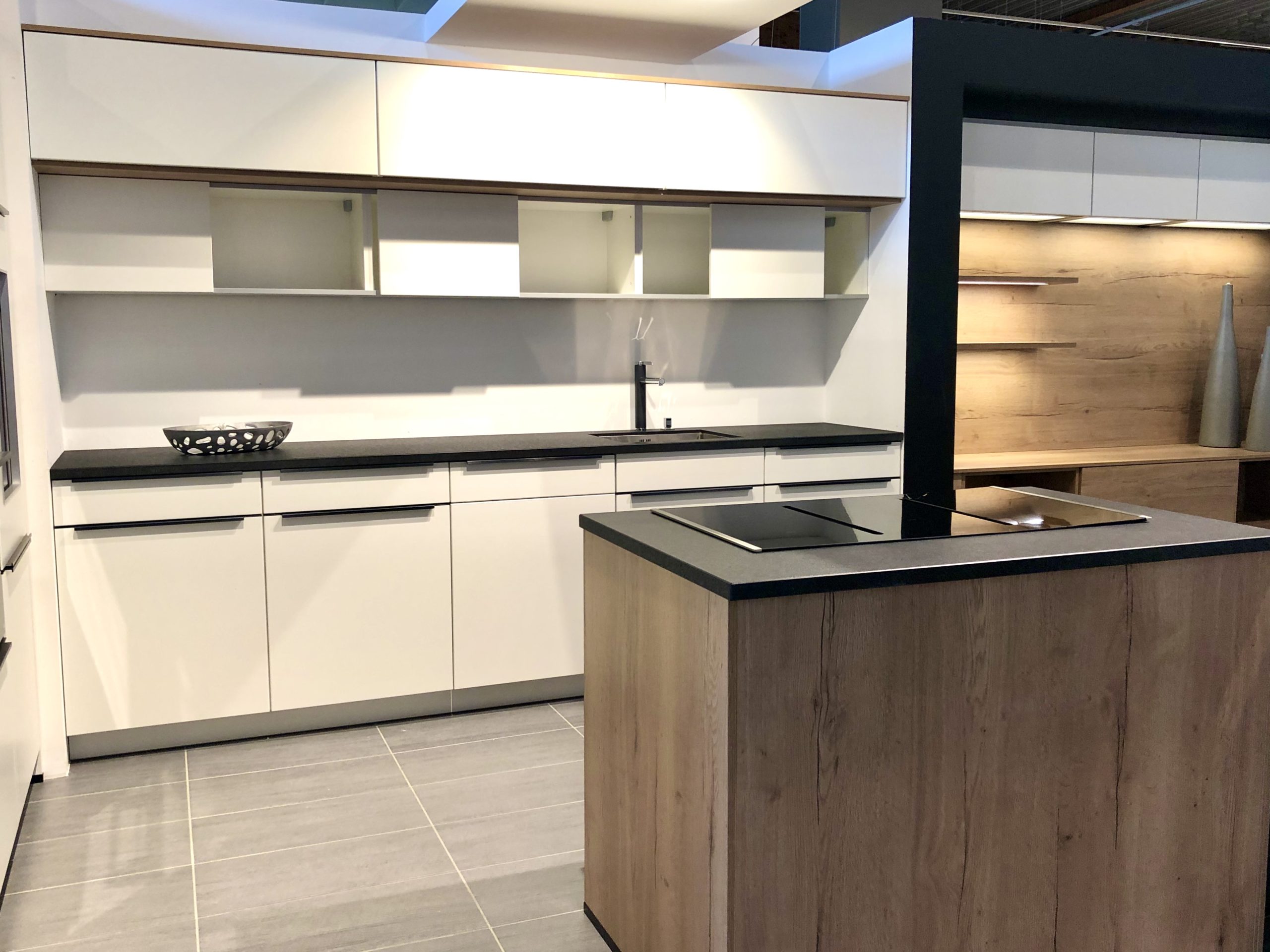 Linea – offene Küche mit angrenzender TV-Einrichtung, weiß matt lackiert in Kombination mit Holz (Eiche Sierra), Wandschränke vorgezogen und mit darunter hängenden Schiebetüren