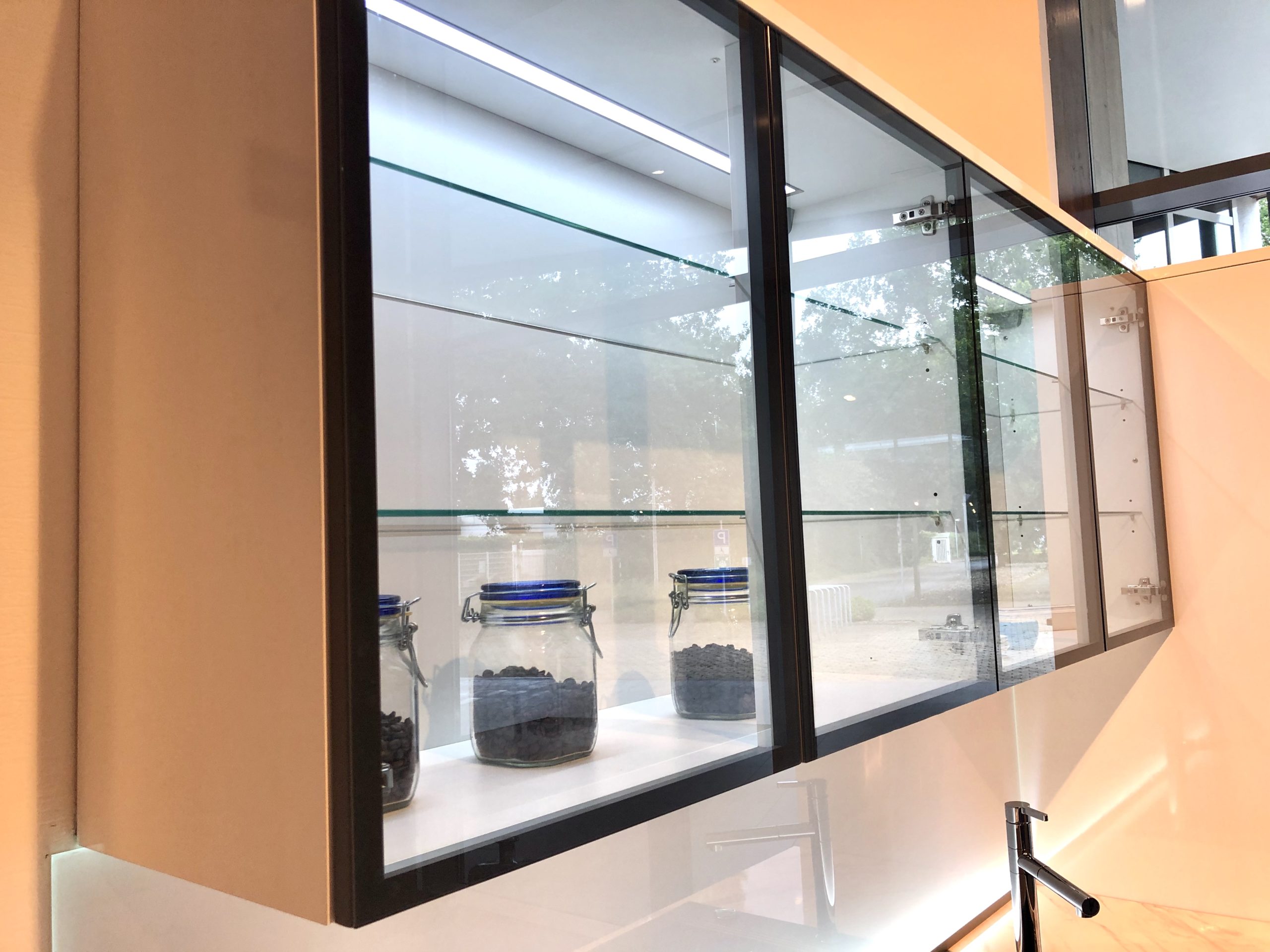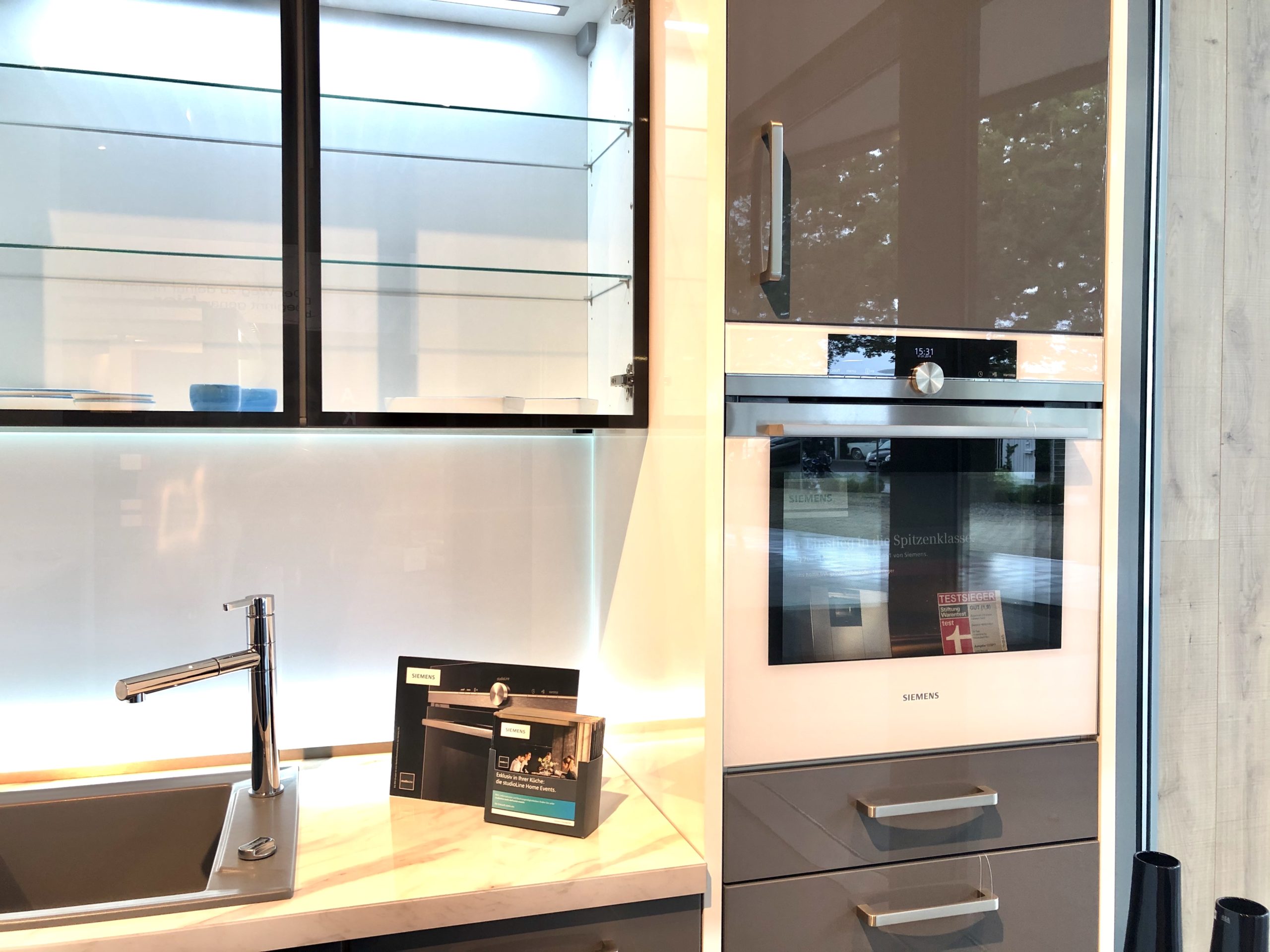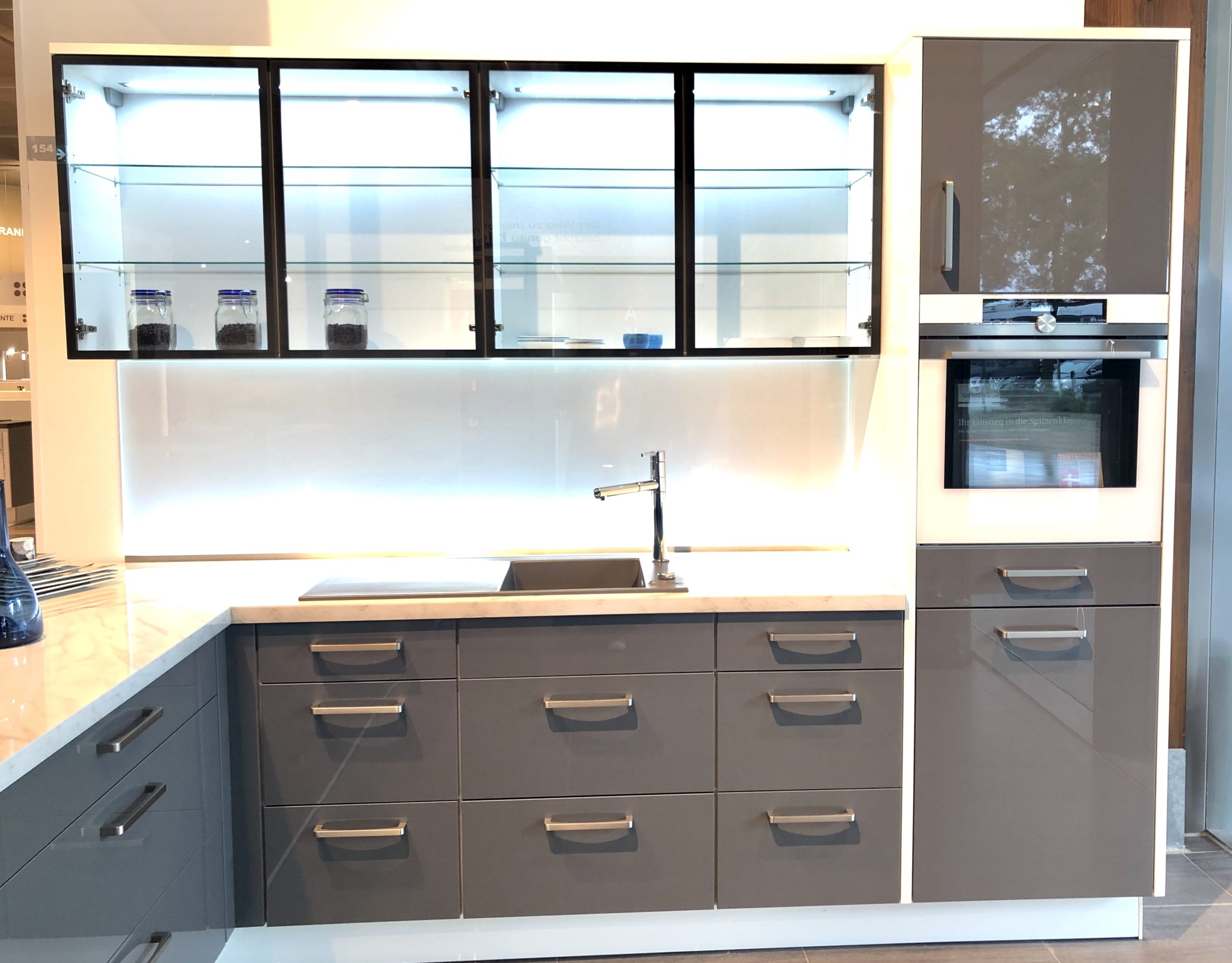 Winkelküche in Hochglanz Lack mit Wandschränken mit Grauglas-Türen, beleuchteter Glas-Nischenrückwand