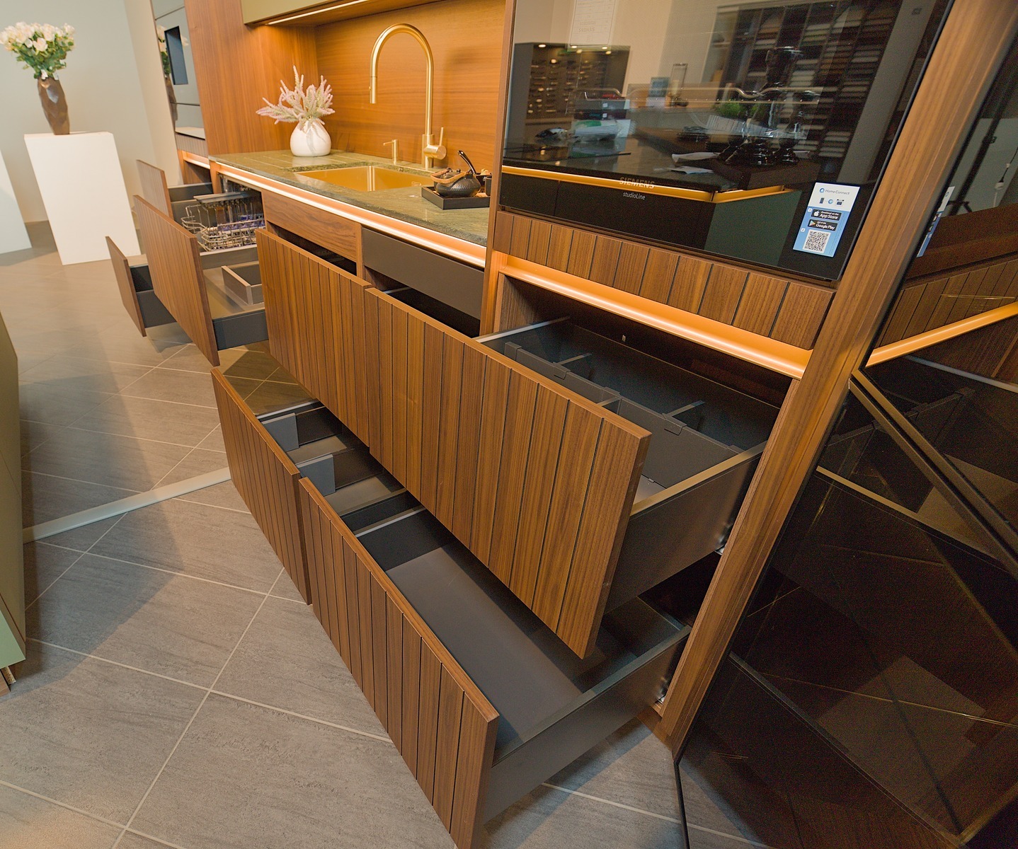 Die Sachsenküchen Leona eine Inselküche mit grifflosem Design ist ein Meisterwerk der modernen Küchengestaltung. Mit beleuchteter Griffleiste und innen beleuchteten Auszügen ist sie nicht nur funktional, sondern auch ästhetisch ansprechend.